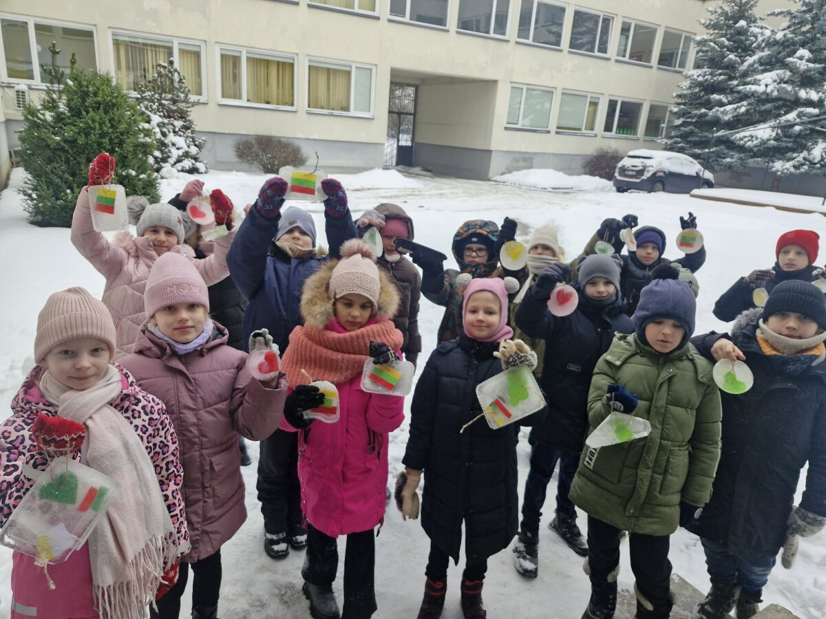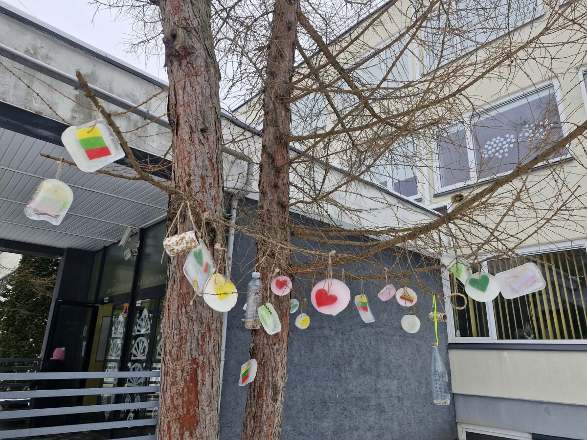 3e klasės mokiniai su džiaugsmu ir kūryba gamino Lietuvos trispalves vėliavėles ir širdeles. Užpylę jas vandeniu, vaikai šaldė darbelius progimnazijos kieme ir gautomis spalvingomis ledo dekoracijomis papuošė medelį.