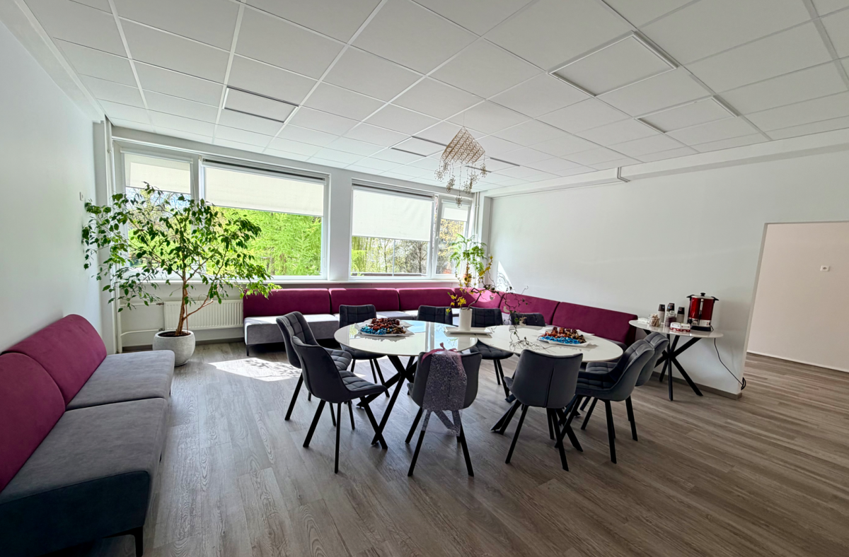 Šis kambarys sukurtas, galvojant apie mokytojų ir viso personalo gerovę. Čia galima prisėsti su puodeliu kavos ar arbatos, pasidalinti mintimis su kolegomis ar tiesiog pabūti tyloje. Šilti interjero akcentai ir rami atmosfera kviečia sustoti, atsipalaiduoti ir pasisemti naujų jėgų.