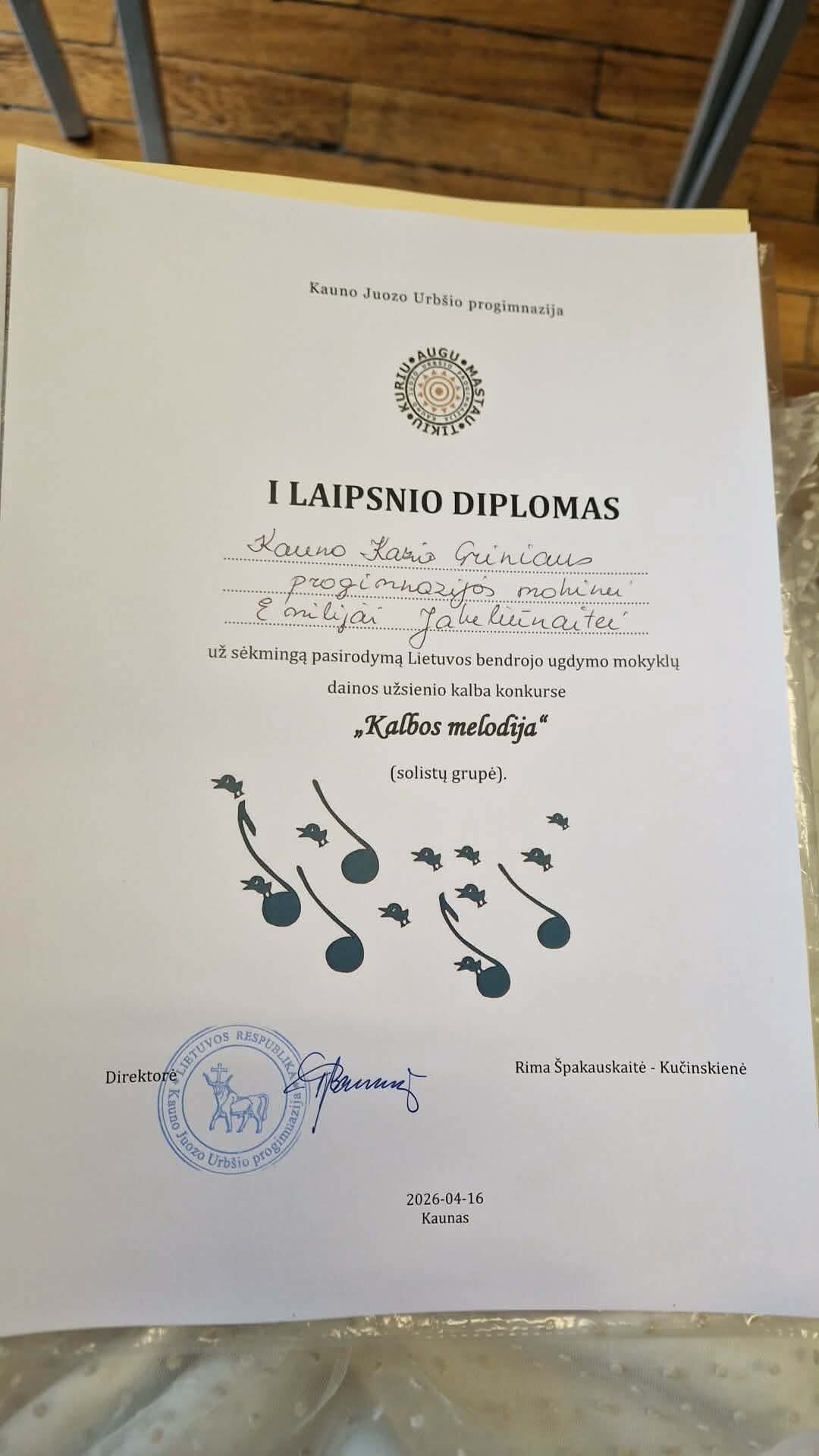 2026 m. balandžio 16 d. Kauno Kazio Griniaus progimnazijoje – džiugi žinia: 5d klasės mokinė Emilija Jakeliūnaitė puikiai pasirodė Lietuvos bendrojo ugdymo mokyklų ir gimnazijų mokinių dainos užsienio kalba konkurse „Kalbų melodijos“.