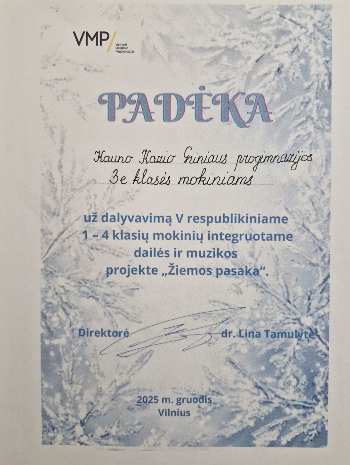 3e klasės mokiniai aktyviai dalyvavo respublikiniame dailės ir muzikos projekte „Žiemos pasaka“, kuris subūrė net 30 ugdymo įstaigų iš visos Lietuvos. Projekto metu mokiniai turėjo galimybę kūrybiškai atsiskleisti – jie ne tik piešė žiemos tematika, bet ir dainavo, perteikdami šventinę nuotaiką per meną ir muziką.