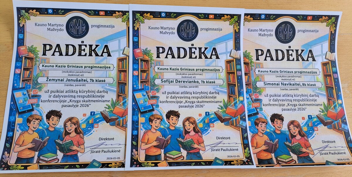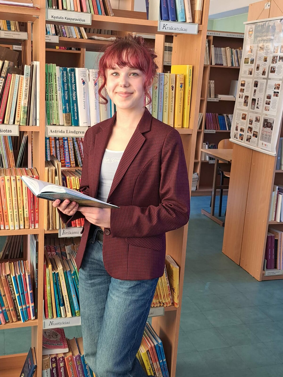 Mūsų mokyklai atstovavo 7b klasės mokinės Žemyna ir Sofija bei 8b klasės mokinė Simona (mokines parengė lietuvių kalbos mokytoja metodininkė Rita Kanaukienė). Be to, konferencijos virtualią edukaciją „Lietuvių autorių paauglių literatūros naujienos ir įdomybės“ nuotoliu per „Zoom“ platformą galėjo stebėti ir 7b klasė. Mokiniams labai patiko susitikimas su rašytoja ir jos knygų pristatymas. Konferencijos metu Žemyna ir Simona pristatė kūrinių iliustracijas, o Simona skaitė savo sukurtą miniatiūrą „Kai skaitau, aš skrendu“.