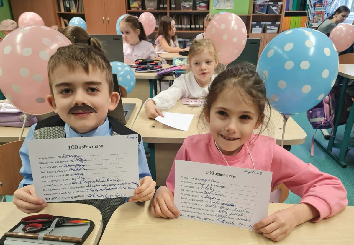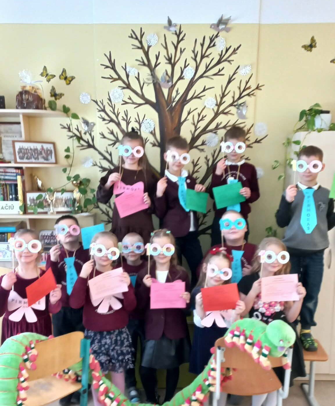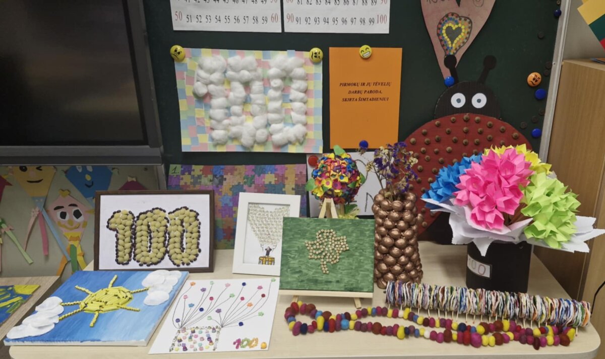 Šia proga tėveliai kartu su vaikais kūrė nuostabius darbelius, kuriuose atsispindėjo skaičius 100 – išradingai, kūrybiškai ir su meile. Nuoširdžiai dėkojame Jums, tėveliai, už kartu su vaikais praleistas akimirkas, už skirtą laiką, kantrybę ir šilumą. Jūsų bendradarbiavimas, palaikymas ir įsitraukimas kuria vaikams saugią, stiprią ir džiaugsmingą mokyklos bendruomenę. Ačiū už nuostabius darbelius, kurie ne tik papuošė klasę, bet ir pripildė ją pasididžiavimo, džiaugsmo bei šimtu šypsenų!