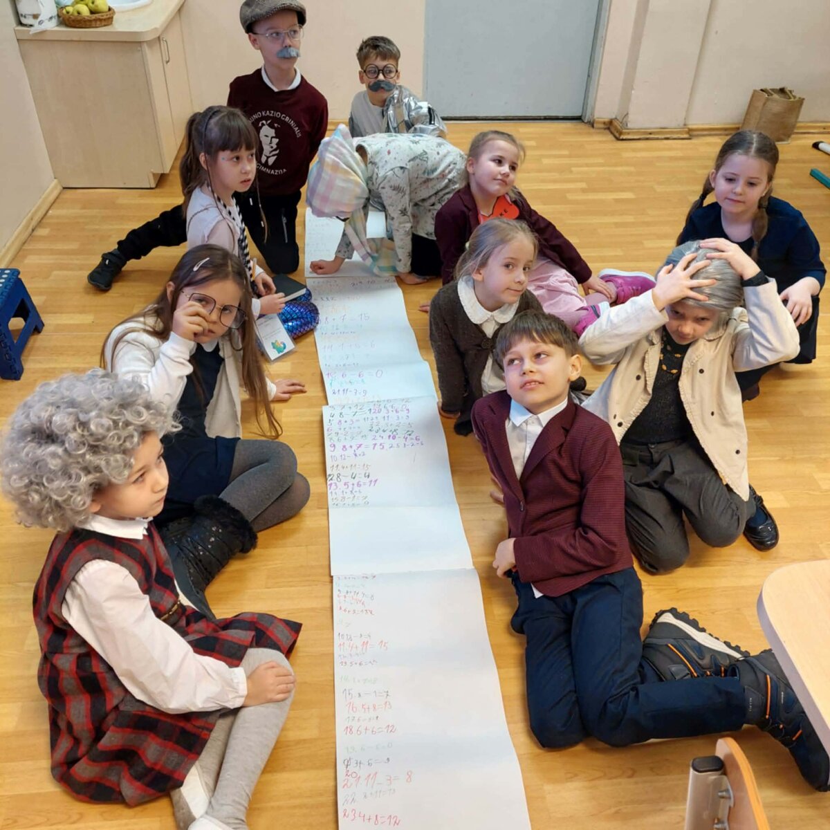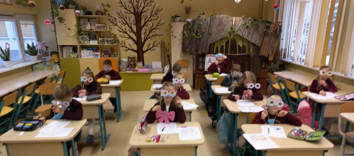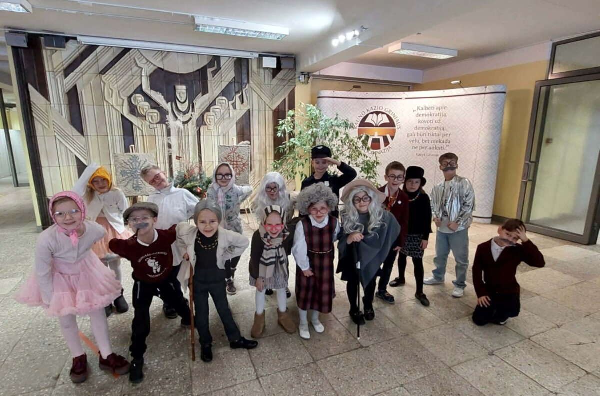 Šventinė diena prasidėjo klasėse, kur vyko smagios ir prasmingos pamokėlės, susijusios su skaičiumi 100. Kad patektum į klasę, reikėjo atlikti ypatingą užduotį – nušokti 100 centimetrų! Tai buvo linksmas iššūkis, kupinas juoko ir azarto. Pamokų metu vaikai: skaičiavo ir atliko įvairias užduotis su skaičiumi 100, kūrė žodžių grandinėles, užbaiginėjo sakinius, skaitė tekstukus, spalvino bei atliko kūrybines užduotis. Ypatingo susidomėjimo sulaukė „stebuklingų akinių 100“ gamyba – kiekvienas galėjo pasijusti išskirtinis ir pažvelgti į pasaulį per šventės džiaugsmą. Šios veiklos dar kartą parodė, kiek daug pirmokai jau išmoko per šimtą dienų – jie drąsiai skaito, skaičiuoja, kuria ir bendradarbiauja. Dar smagiau buvo tada, kai pirmokai persirengė ir pristatė, kokie jie bus po šimto metų –tuomet mokykloje netrūko nei juoko, nei aplodismentų!