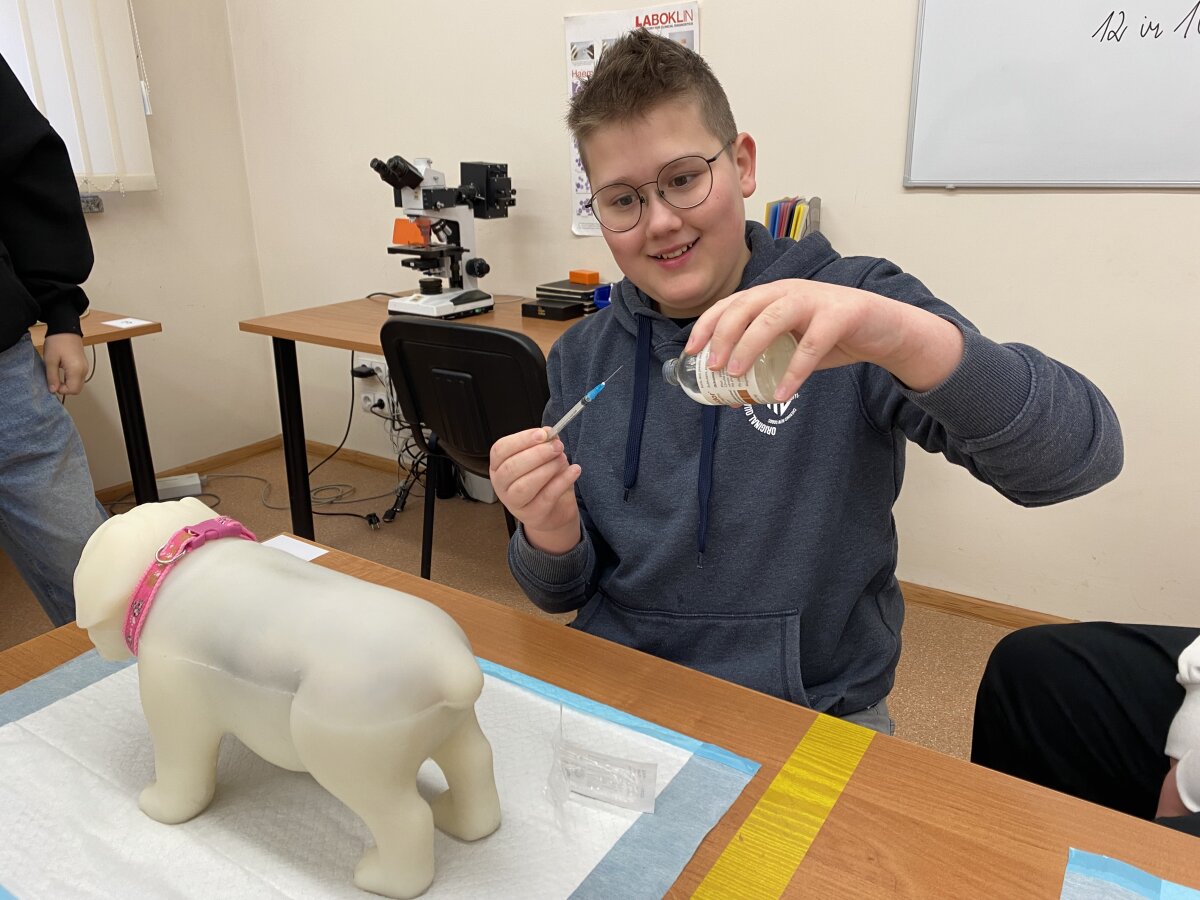 Po paskaitos mokiniai turėjo galimybę apsilankyti simuliacijos centre, kur dirbo su gyvūnų muliažais. Šiame centre jie mokėsi, kaip suleisti gyvūnams vaistus ir atlikti kraujo paėmimo procedūras iš venos. Tai nebuvo paprasta praktika – tai buvo tikra adrenalino ir atradimų kupina patirtis! Mokiniai entuziastingai dirbo su muliažais, o kiekvienas sėkmingai atliktas veiksmas suteikė jaudulio ir pasitikėjimo savimi jausmą, leidžiantį pajusti, ką reiškia būti veterinarijos gydytoju.