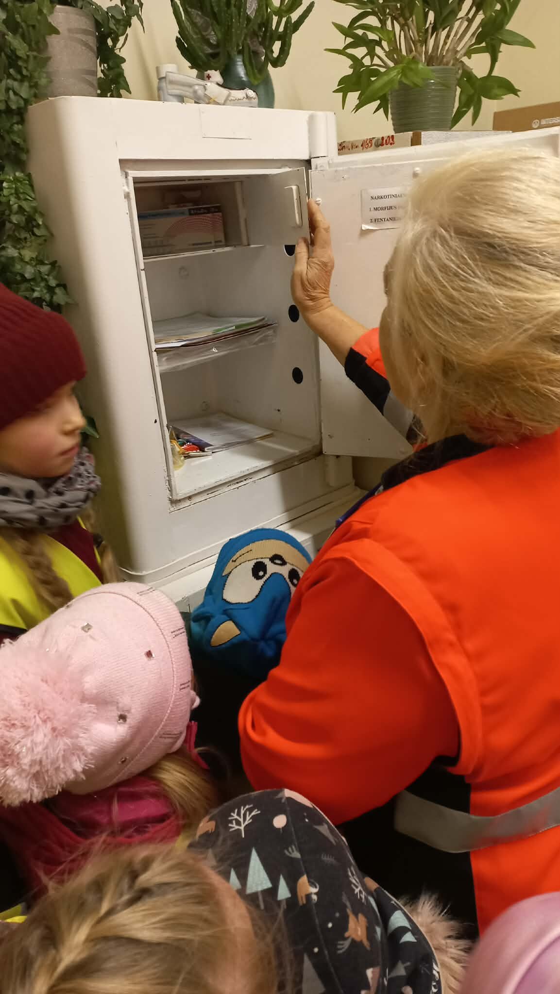 Lankėmės ir kabinete, kuriame paramedikams išduodami vaistai. Čia sužinojome, kad visi vaistai yra griežtai apskaitomi, laikomi saugiai, o prieš kiekvieną budėjimą atsakingai patikrinami. Taip pat buvome sveikatos patikros kabinete, kuriame tikrinama pačių paramedikų sveikata – juk tik gerai besijaučiantys ir pasiruošę specialistai gali saugiai ir atsakingai padėti kitiems.