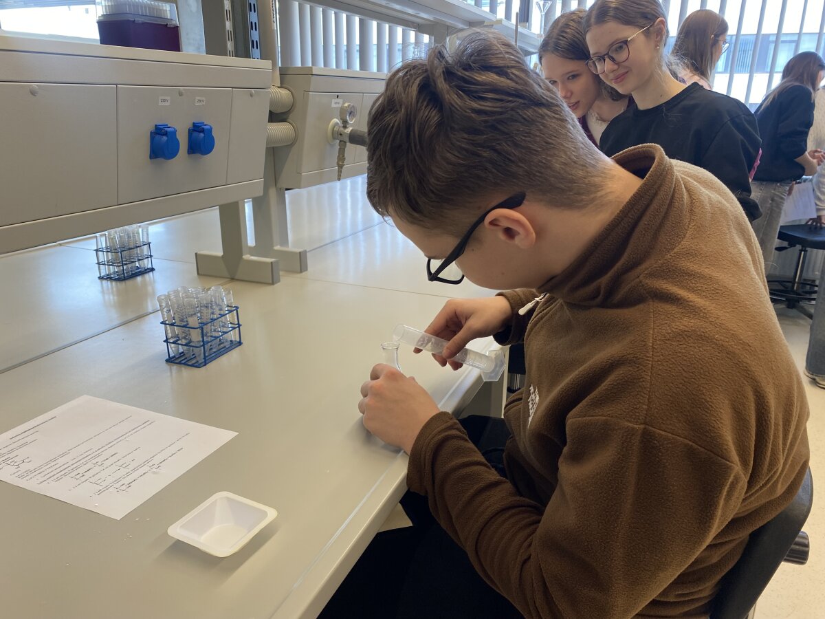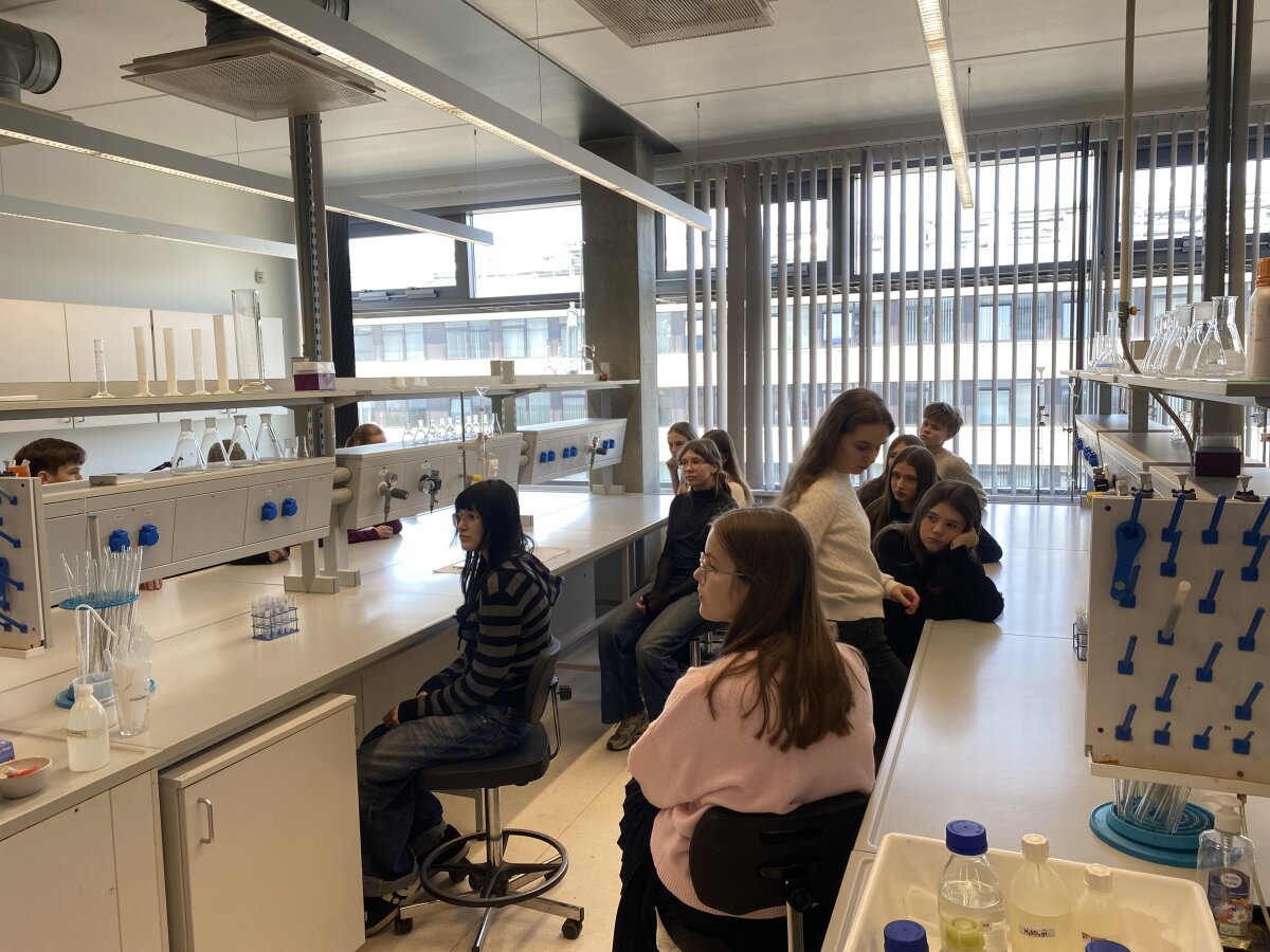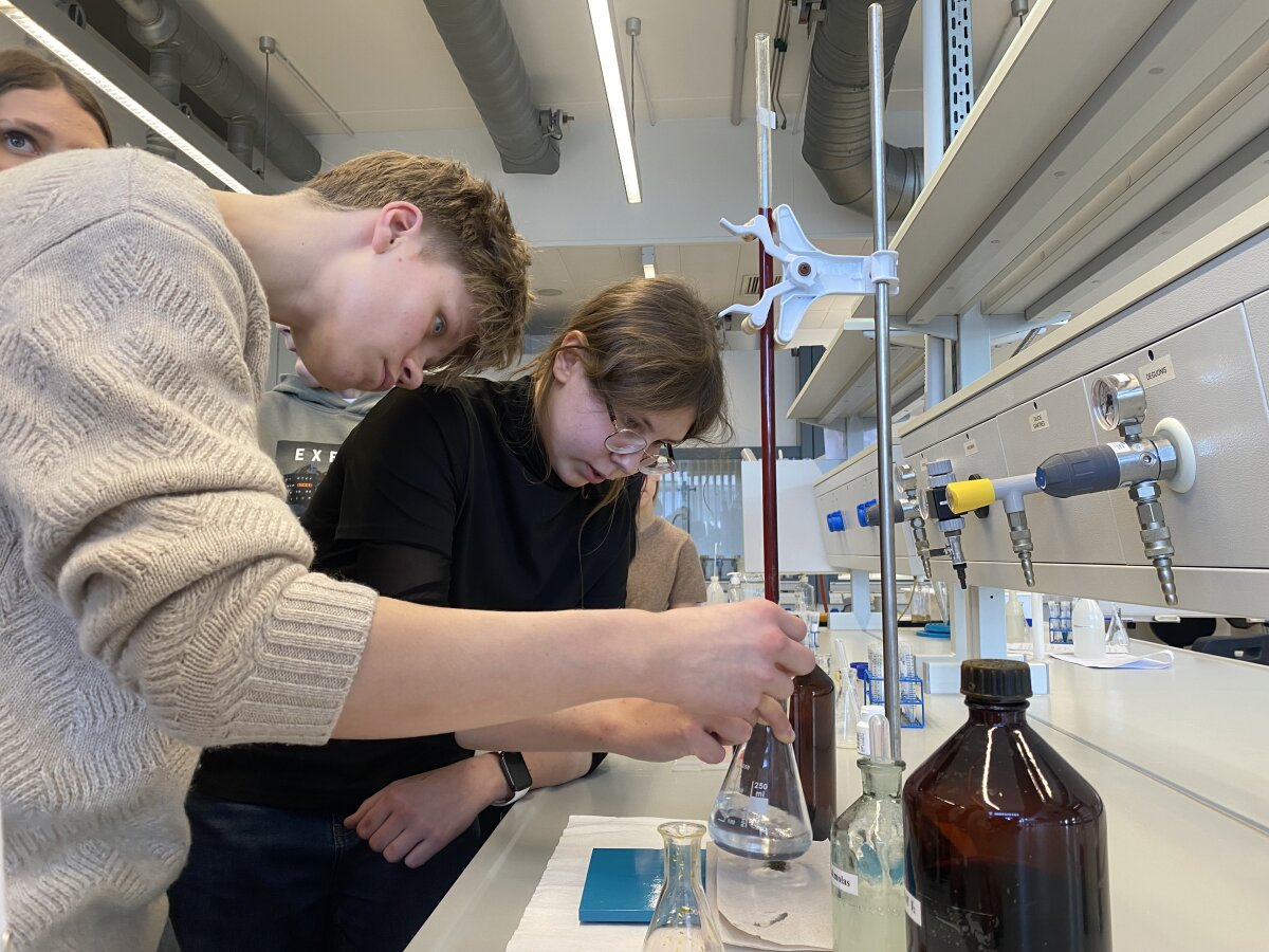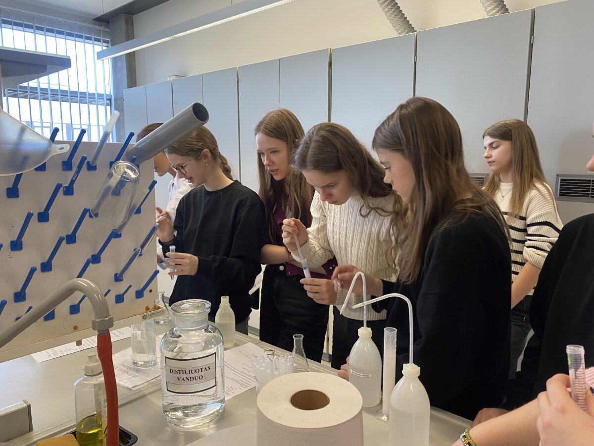 Vėliau aštuntokai lankėsi LSMU Farmacijos fakultete, kur dalyvavo laboratoriniame užsiėmime „Vaistų kokybės vertinimas“. Prieš praktinę veiklą mokiniai išklausė paskaitą apie tai, kaip kuriami vaistai: kiek laiko užtrunka jų kūrimas, kiek tai kainuoja ir kiek skirtingų tyrimų reikia atlikti, kol vaistas pasiekia pacientus. Laboratorinio užsiėmimo metu mokiniai patys atliko įvairius eksperimentus. Dirbdami su skirtingomis medžiagomis ir reagentais, jie galėjo stebėti chemines reakcijas – kai kur keitėsi tirpalų spalva, kitur susidarydavo nuosėdos ar vyko kiti įdomūs reakcijų procesai. Tai buvo puiki galimybė praktiškai pritaikyti chemijos žinias ir patirti, ką reiškia dirbti tikroje laboratorijoje: tiksliai atlikti veiksmus, stebėti rezultatus ir įvertinti, ar eksperimentas pavyko.