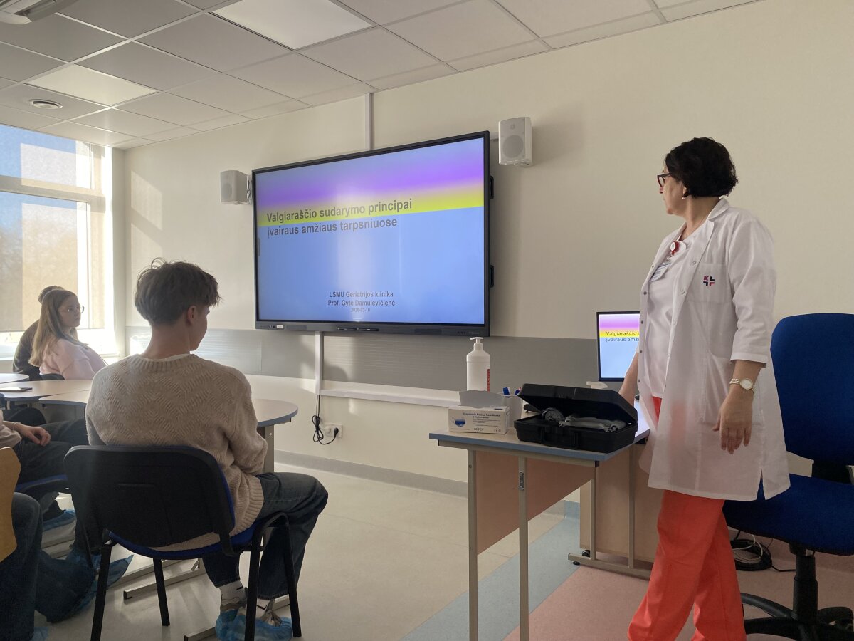 Pirmiausia mokiniai vyko į Kauno 2-ąją ligoninę, kur jų laukė susitikimas su profesore Gyte Damulevičiene. Ji vedė edukaciją tema „Valgiaraščio sudarymo principai įvairiuose amžiaus tarpsniuose“. Paskaitos metu mokiniai sužinojo, kaip skiriasi mitybos poreikiai vaikystėje, suaugus ir vyresniame amžiuje, kokie principai padeda sudaryti subalansuotą valgiaraštį ir kodėl svarbu atsižvelgti į žmogaus amžių bei sveikatos būklę. Po paskaitos mokiniai dalyvavo ekskursijoje Geriatrijos klinikoje, kur galėjo iš arčiau susipažinti su aplinka, kurioje dirba sveikatos priežiūros specialistai.
