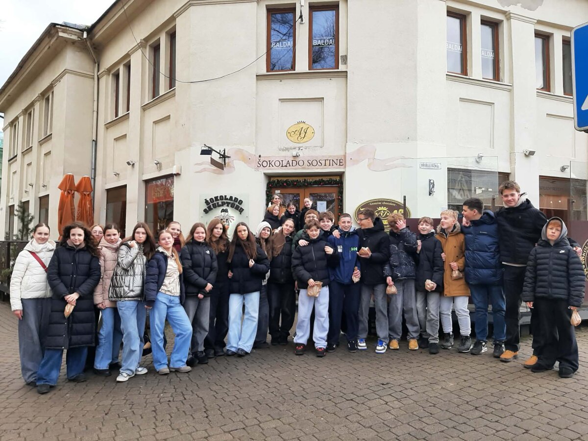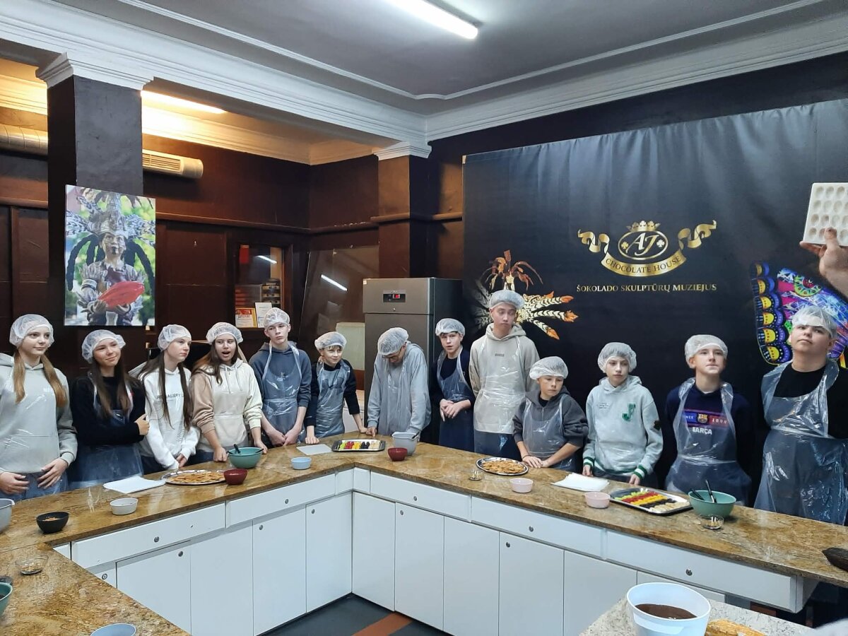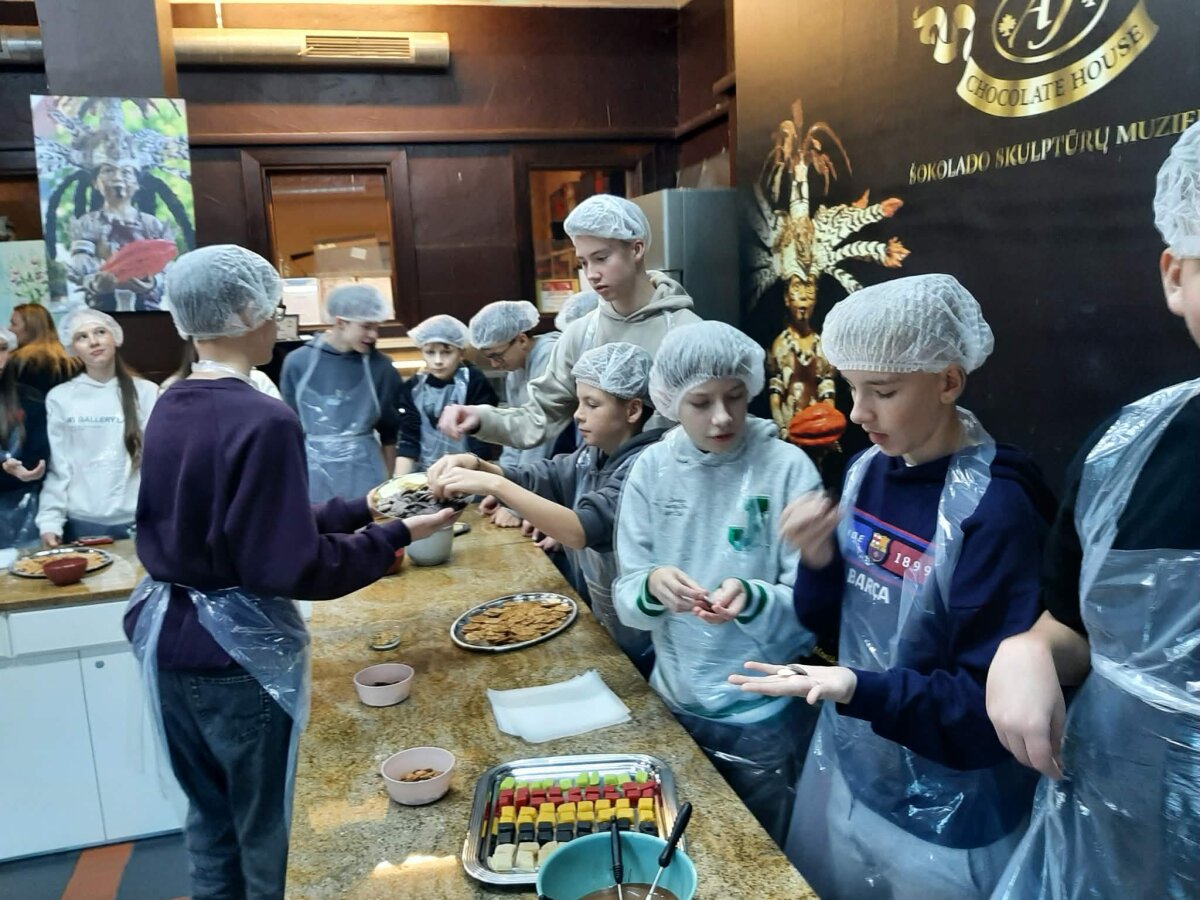 7c klasės mokiniai dalyvavo tikro šokolado gaminimo šou ir degustacijoje „AJ šokolado“ manufaktūroje Trakuose. Tai buvo patyriminio ugdymo veikla, kurioje žinios įgyjamos per asmeninį išgyvenimą, veiklą ir refleksiją – mokiniai ne tik stebėjo procesą, bet ir patys tapo kūrėjais. Edukacijos metu, susipažinę su šokolado gaminimo paslaptimis, jie patys gamino šokoladinius saldainius, ugdydami kūrybiškumą, kruopštumą ir komandinio darbo įgūdžius, o vėliau rinko gražiausiai pagamintą saldainį. Taip pat mokiniai aktyviai atsakinėjo į klausimus apie šokoladą, pritaikė naujai įgytas žinias ir laimėjo prizų. Kelionę vainikavo apsilankymas šokolado muziejuje, kuriame per autentiškus eksponatus ir pasakojimus mokiniai susipažino su šokolado istorija, kultūrine reikšme ir įdomybėmis.